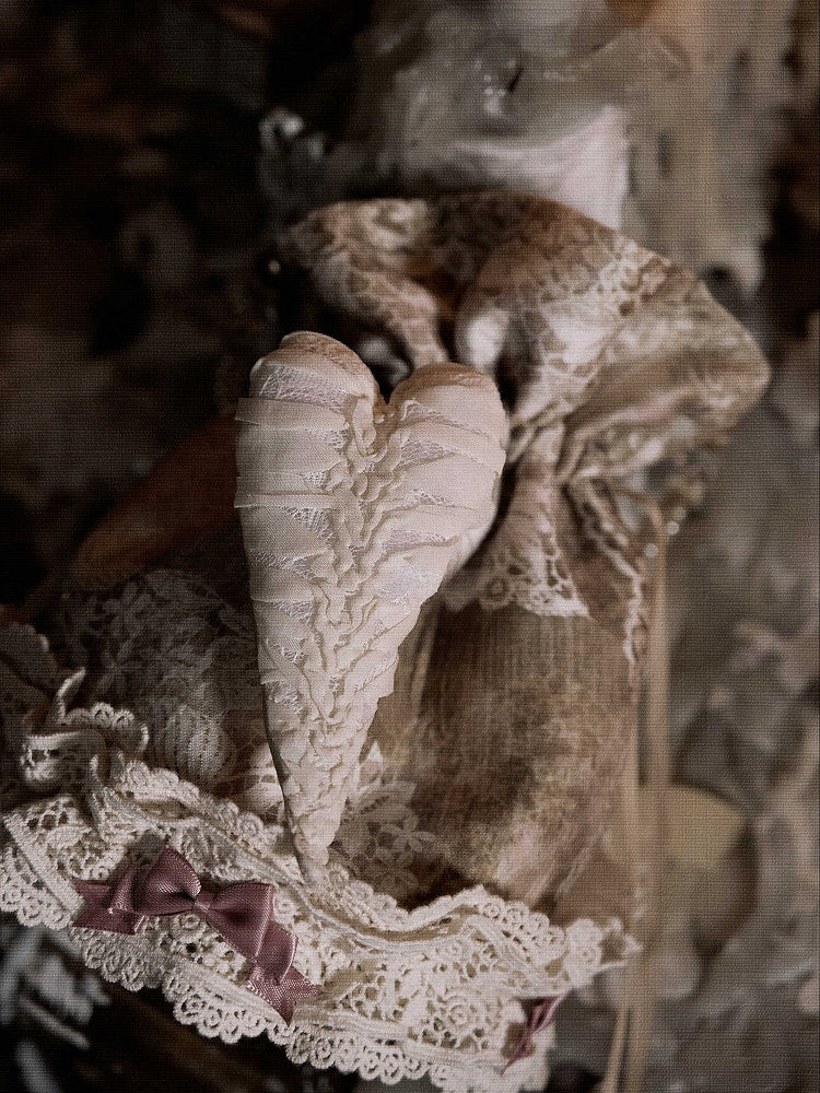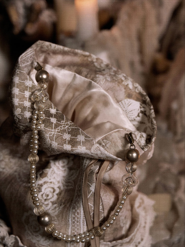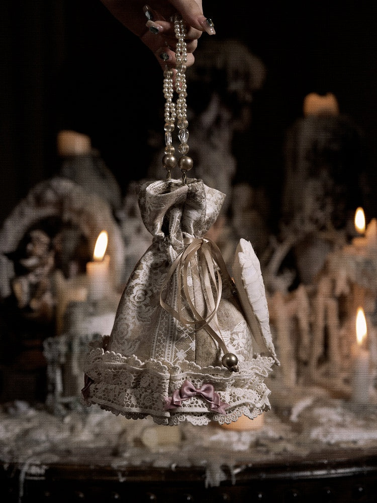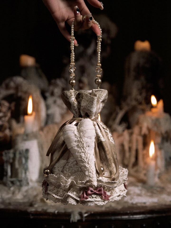 This handbag boasts a unique beaded strap that adds a touch of sophistication and whimsy to your ensemble, the base is adorned with a delicate ring of pure cotton lace, striking grey-pink bows embellishment graces the bag, adding a hint of color and playfulness. To complete its enchanting design, a lovely heart pin is attached, symbolizing love and nostalgia.