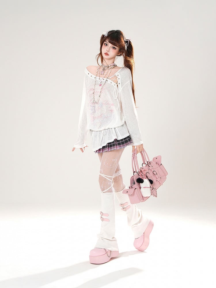 Lace-up Asymmetrical Neckline Blue/White Semi-sheer Coverup
