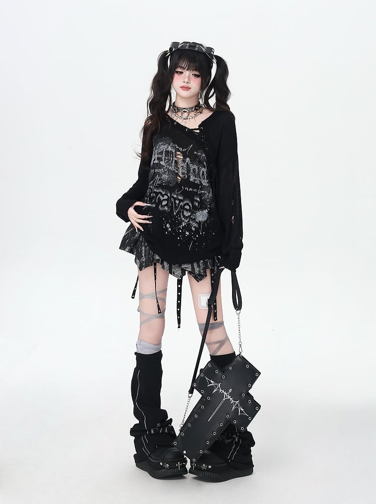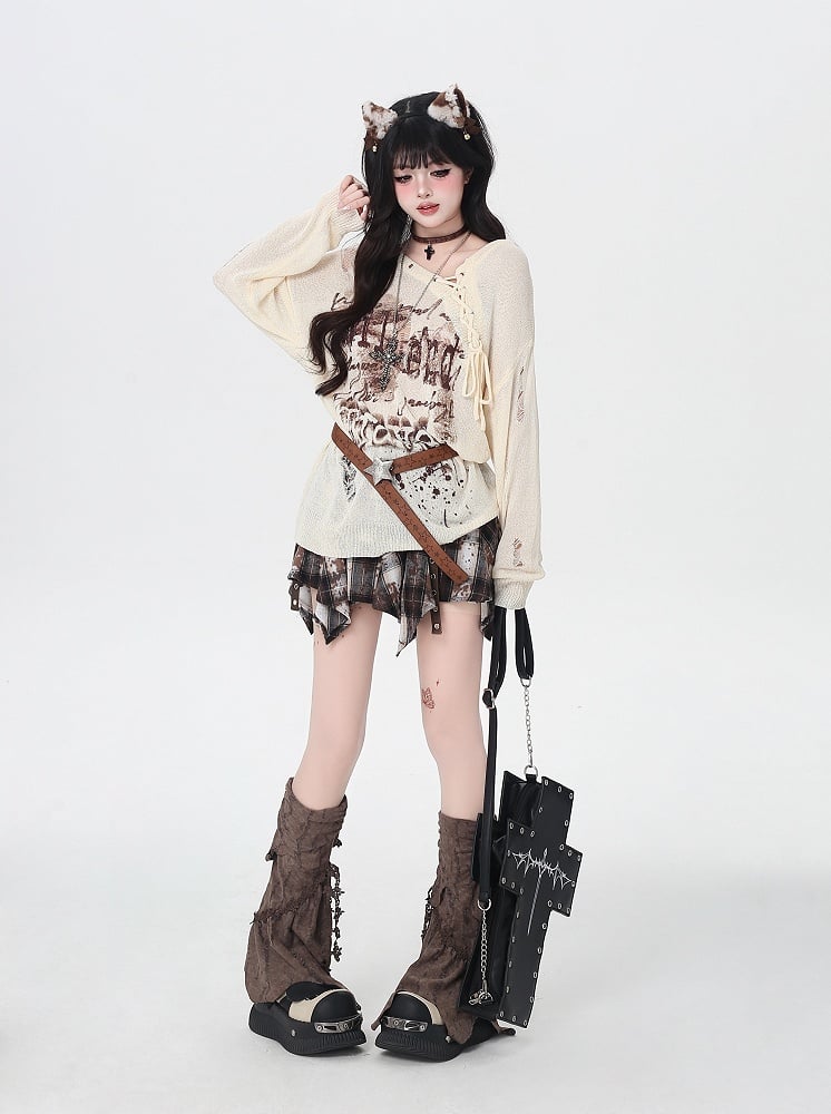 Embrace a fusion of chic and rebellious style with this cover-up, featuring a daring lace-up neckline that adds a touch of allure. The distressed holes bring an edgy, worn-in vibe, making it perfect for layering over your favorite outfits.