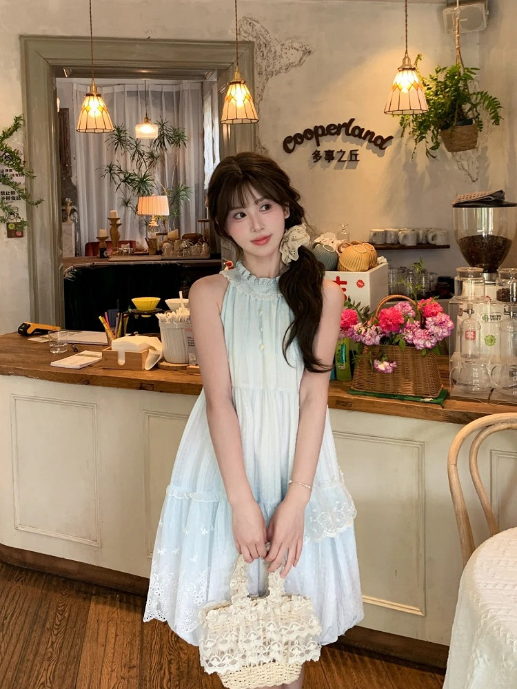 Light Blue Ruffled Halter Neck Bead Buttons Sleeveless Dress Bubble Skirt