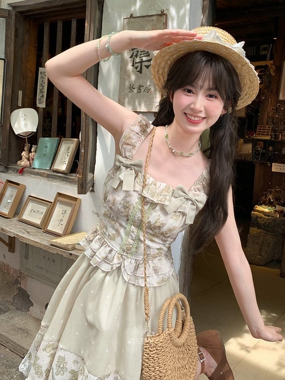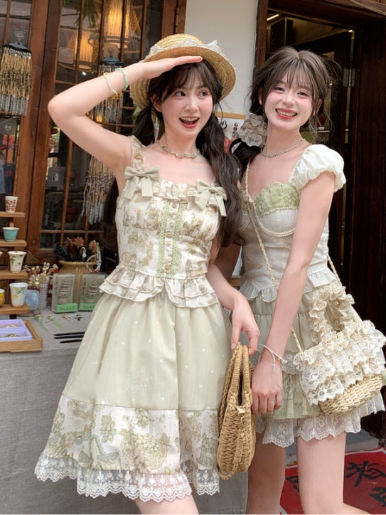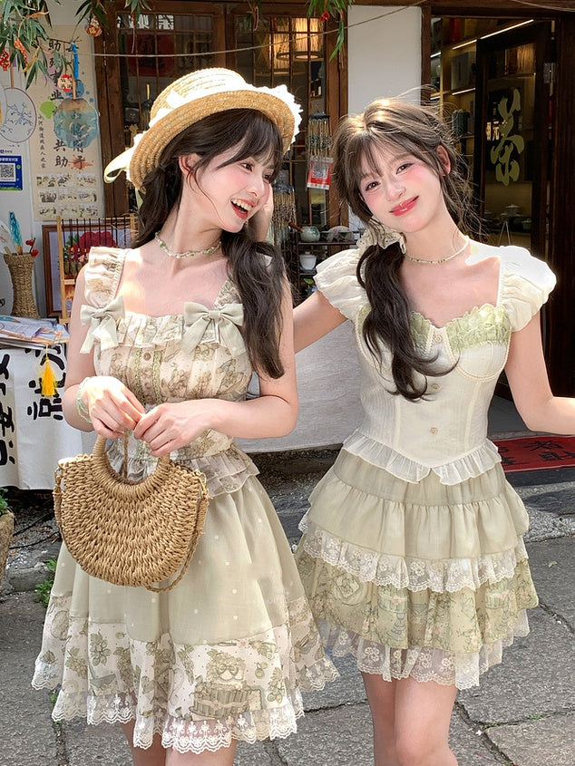 Light Green Vintage Grape Print Sleeveless Top with Detachable Bowknots