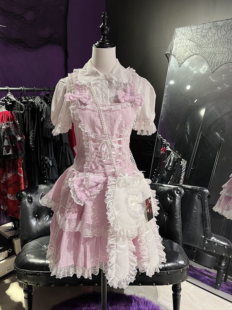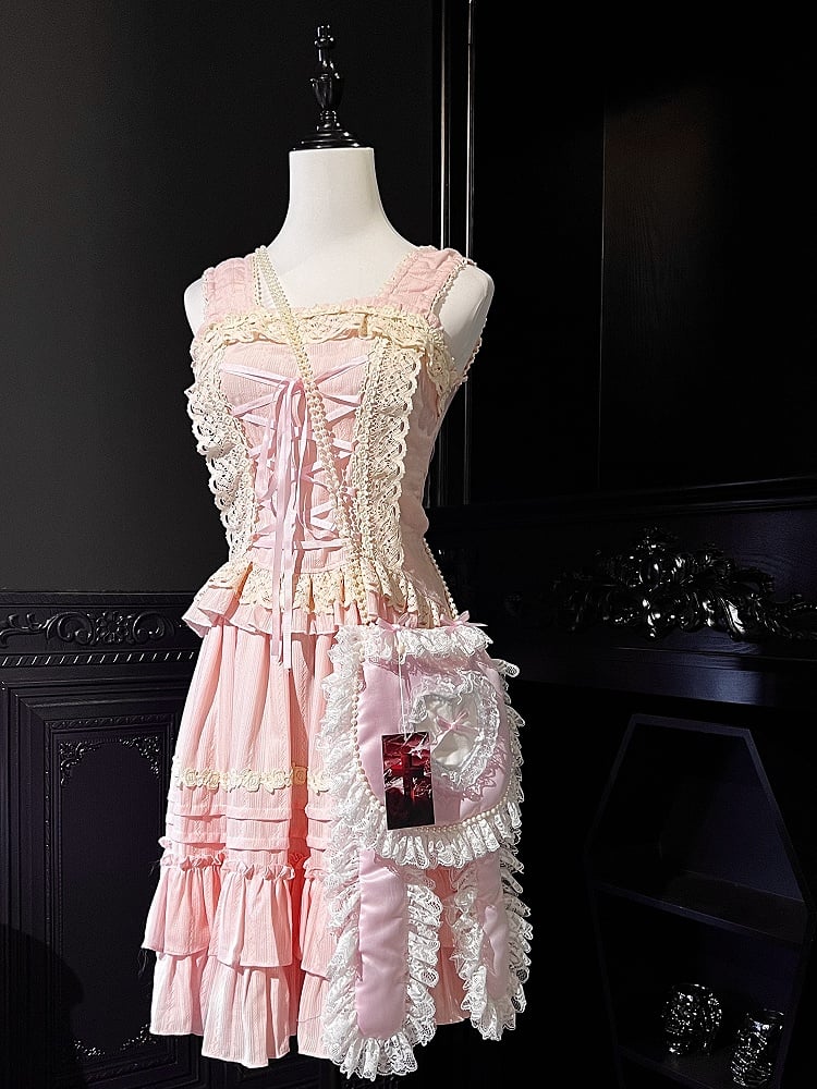 This is a Lolita-style crossbody bag with exquisite white lace trimmings.The bag features a heart-shaped design in the center, adorned with a bow. It is suspended by two strings of pearl-like beads. The overall design is very sweet and unique, making it a standout accessory.