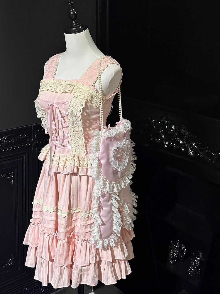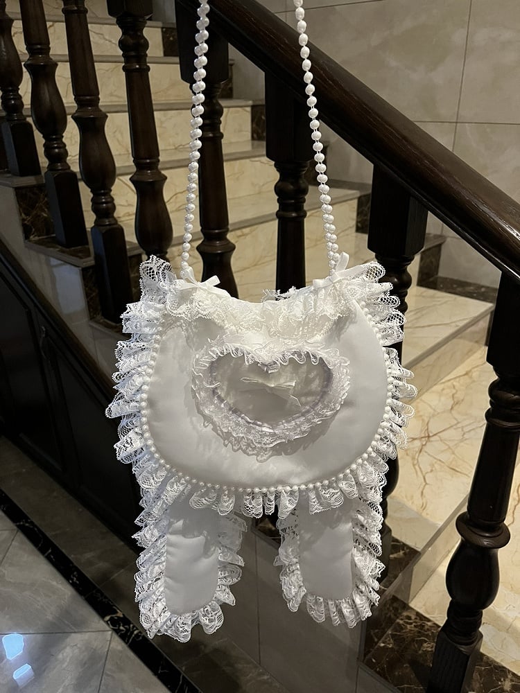 The bags adorned with exquisite white lace detailing. At the heart of this charming bag is a heart-shaped design, beautifully accented with a delicate bow. The straps are elegantly crafted with strands of pearl-like beads, adding a touch of sophistication to this accessory.