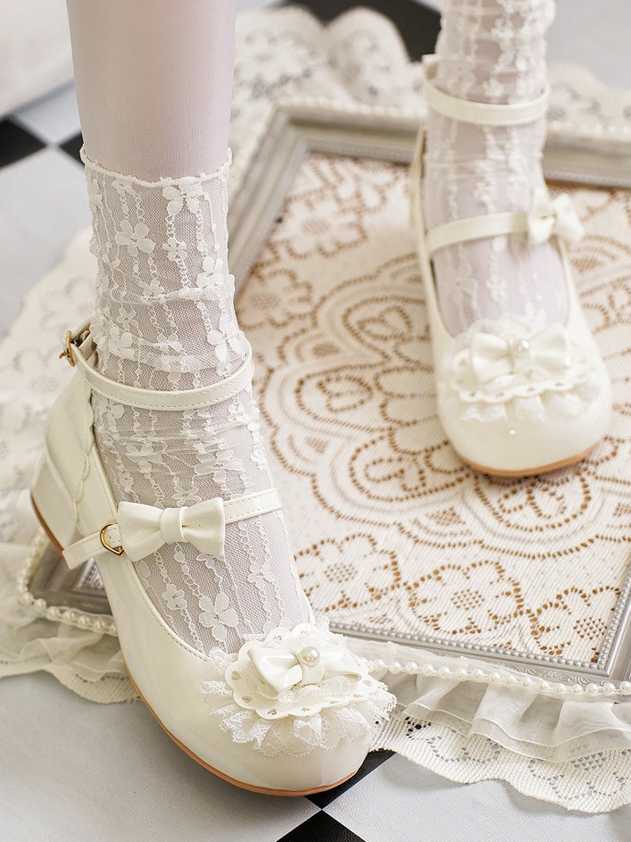 Milky White Bow at Top Lace Trim Heart Buckles Round Toe Lolita Shoes