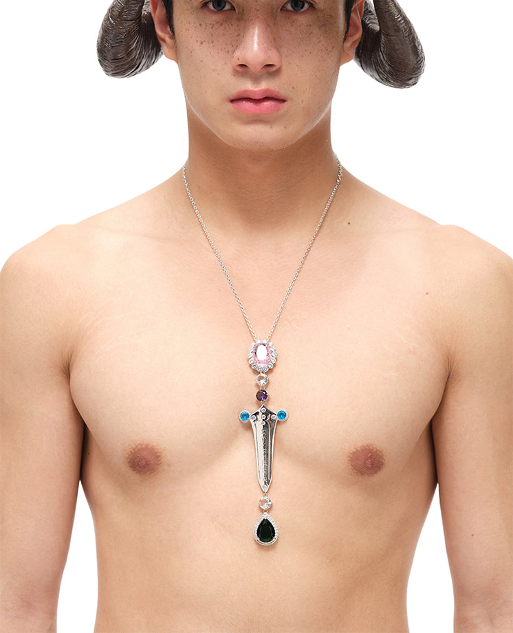 Multi-colored Rhinestones Silver Sword Charm Necklace