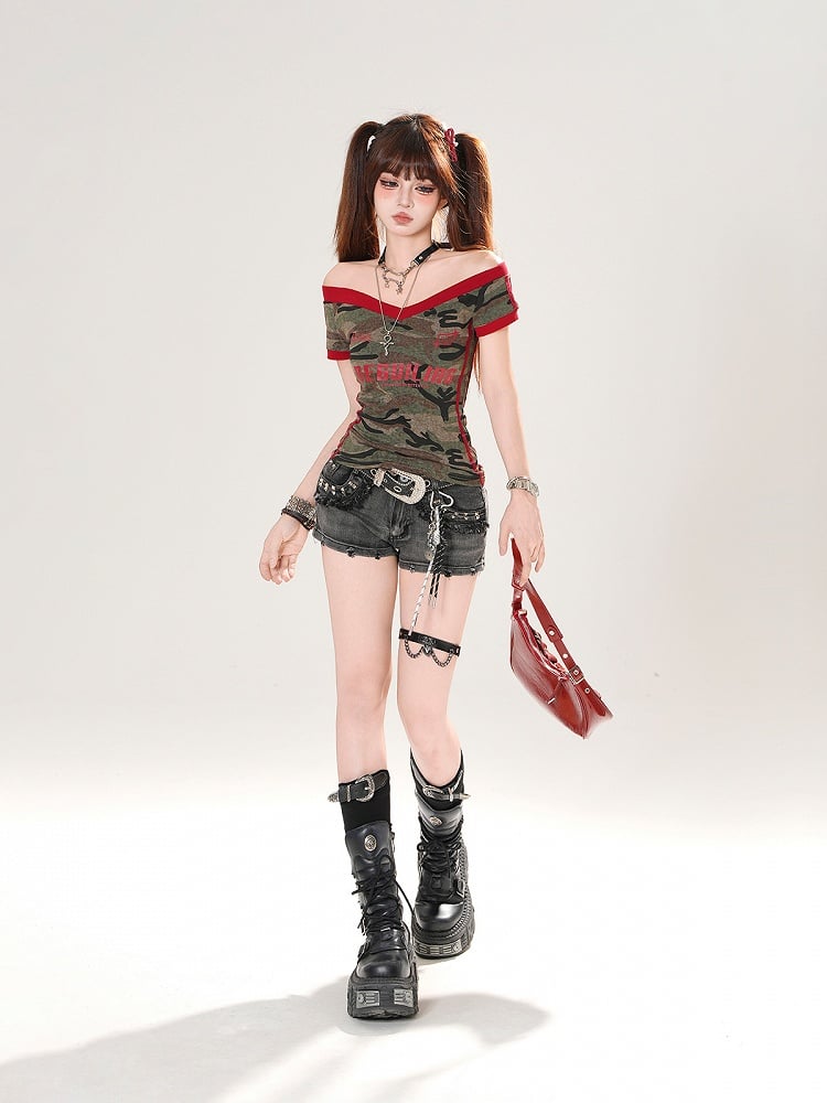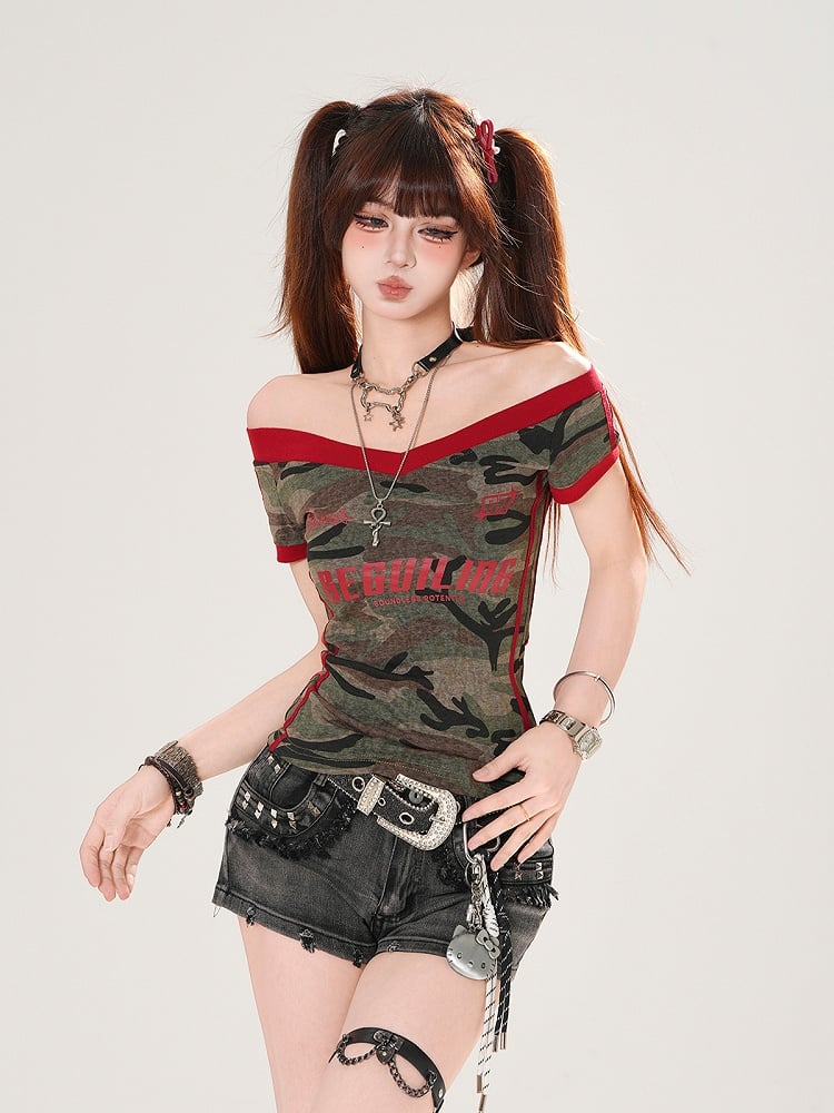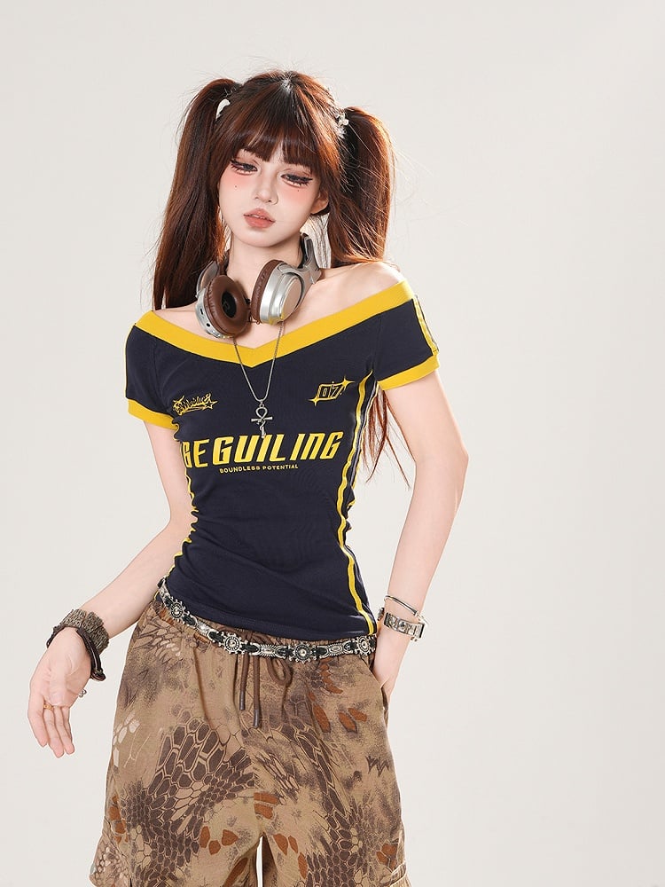 Navy Blue/Army Green Off-the-shoulder Neckline Letter Print T-shirt