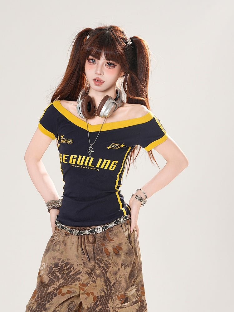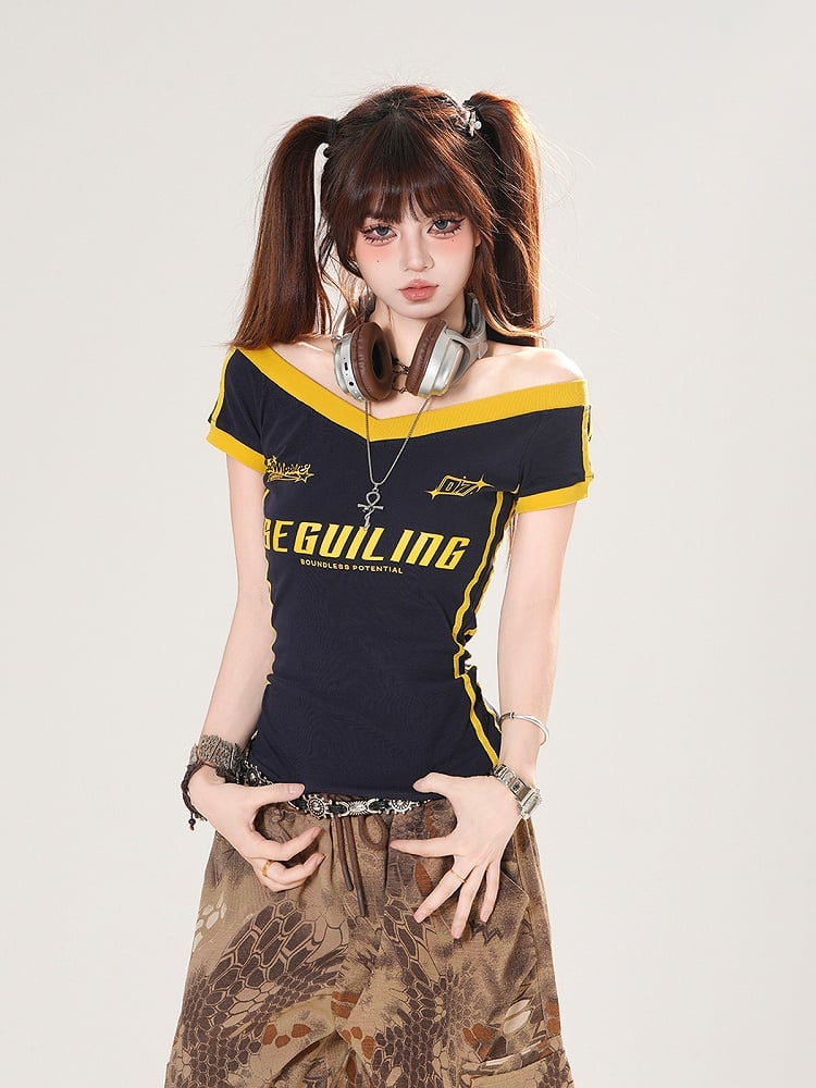 Effortlessly blend casual comfort with a touch of playful elegance in this off-the-shoulder t-shirt. Featuring a trendy letter print, this top is perfect for adding a hint of modern flair to your everyday ensemble.