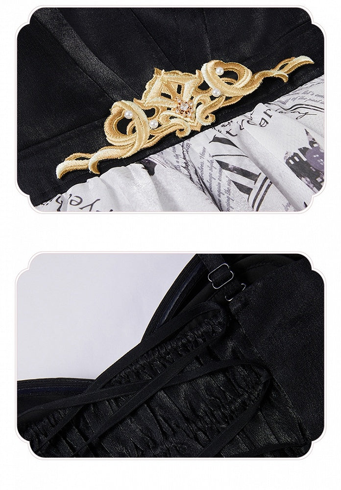 Designed for the discerning Lolita fashion enthusiast, this dress features a unique newspaper print that adds a touch of vintage charm. The layered handkerchief hem creates a graceful, flowing silhouette that is both eye-catching and sophisticated.