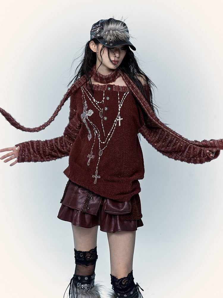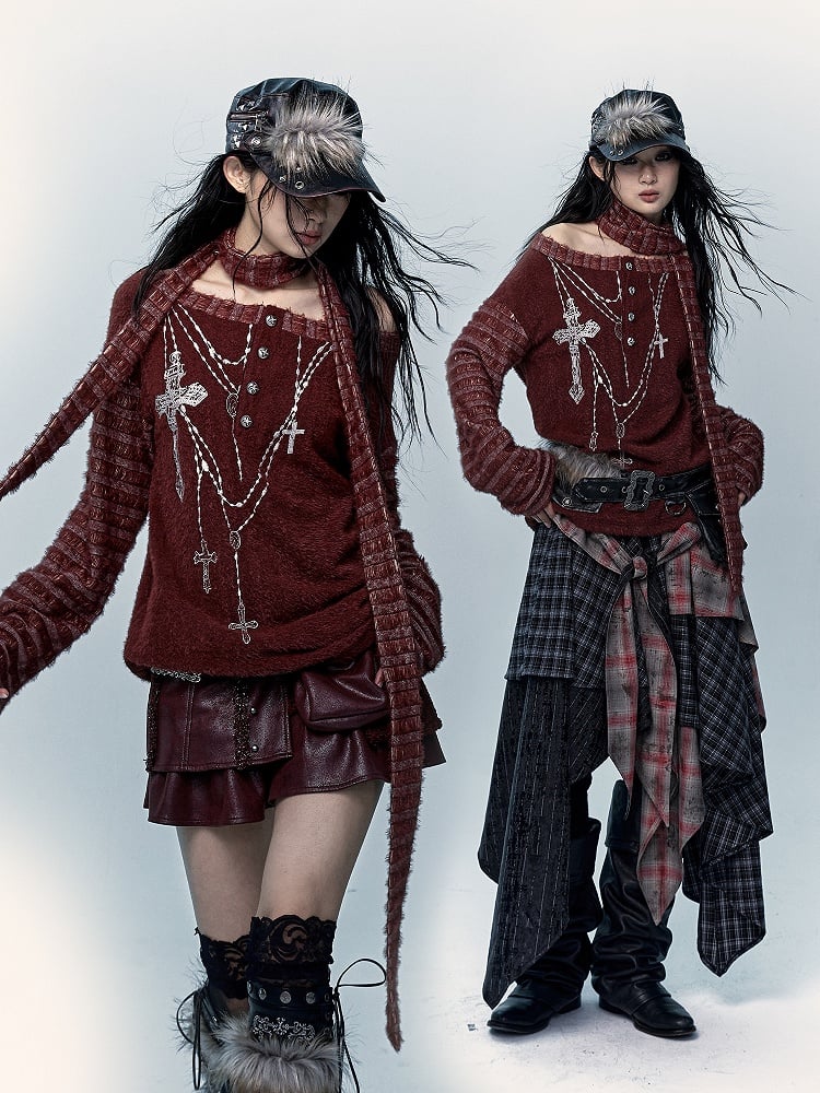 Elevate your style with this enchanting off-shoulder top, available in charming red. The design perfectly blends a playful and chic look, featuring a delicate off-the-shoulder neckline that adds a touch of romance. This top is adorned with intricate cross embroidery, adding a hint of punk elegance to its kawaii appeal. Perfect for those who love to mix cute and edgy elements, this piece is an ideal addition to your wardrobe for both casual outings and special occasions. Pair it with your favorite skirt or jeans for a standout look that captures attention.