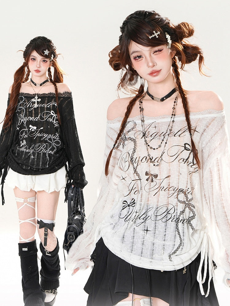Off-the-shoulder Neckline Bowknot Print Black/White Semi-sheer Coverup