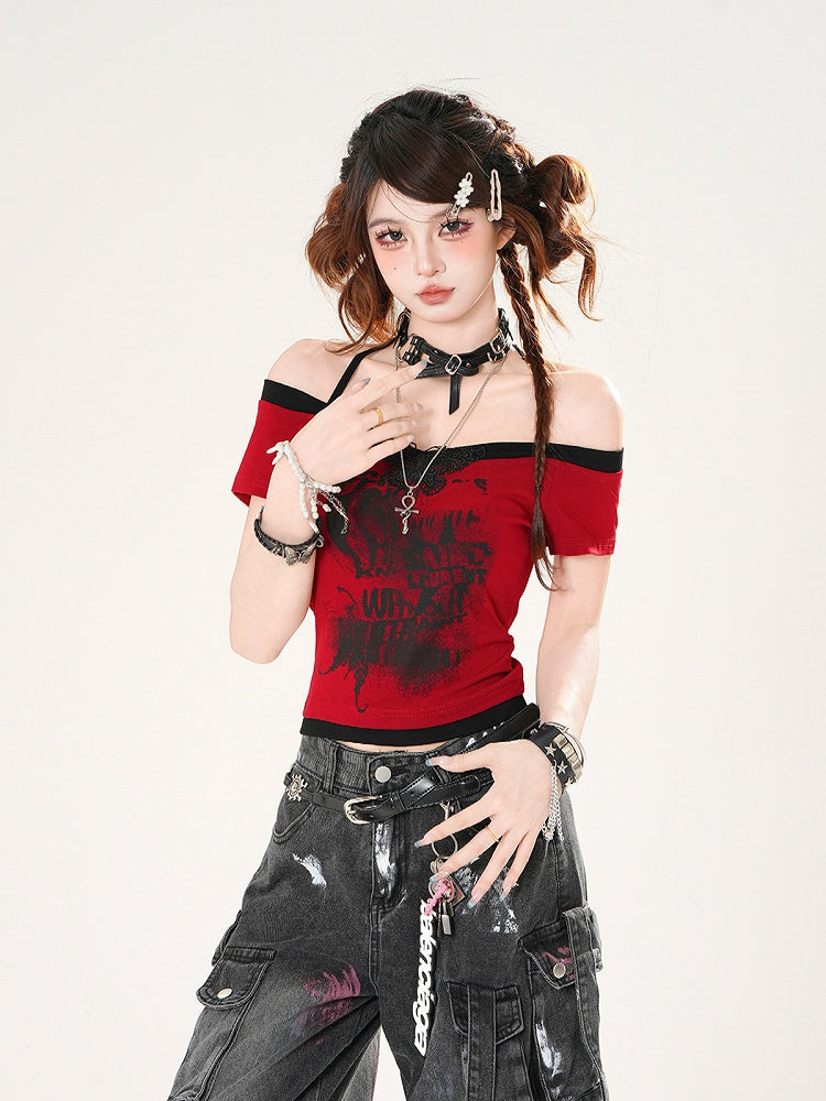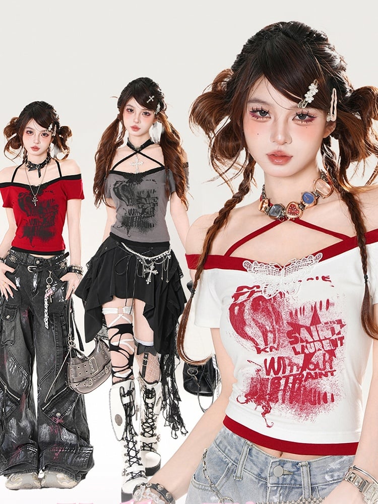 Off-the-shoulder Neckline Butterfly Applique Red/White/Gray Halter Neck T-shirt