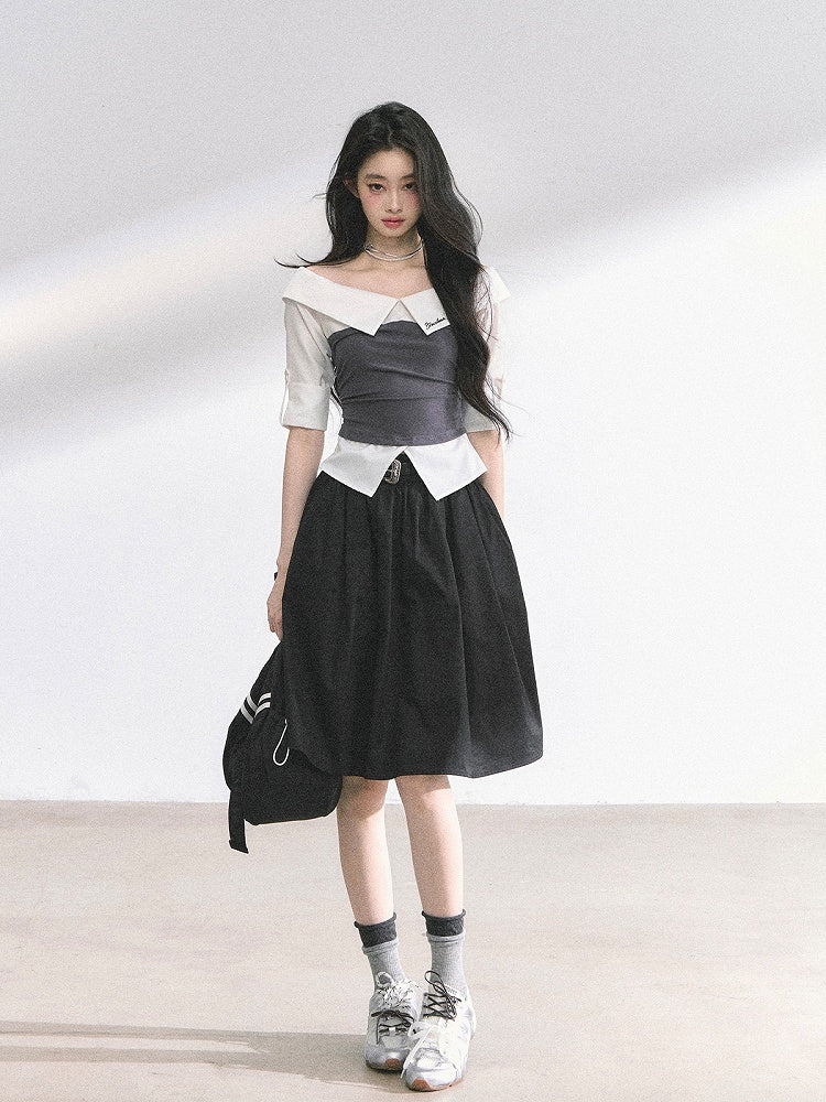 Elevate your wardrobe with this sophisticated off-the-shoulder shirt, featuring a chic foldover collar that adds a touch of elegance to any outfit. Crafted from high-quality, breathable fabric, this versatile top is perfect for both casual outings and dressier occasions. The off-the-shoulder design beautifully highlights your neckline and shoulders, offering a flattering silhouette.
