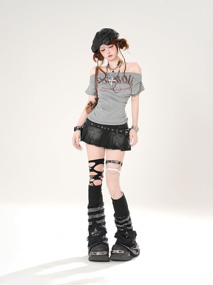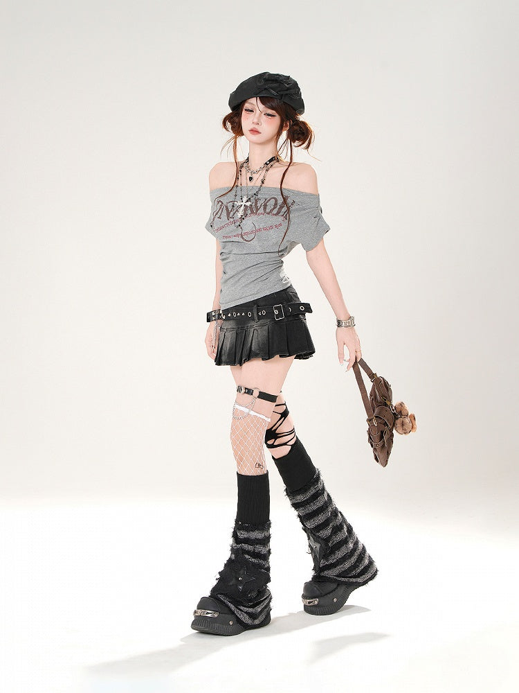 Off-the-shoulder Neckline Letter Print Gray/Navy Blue Slim-fitting T-shirt