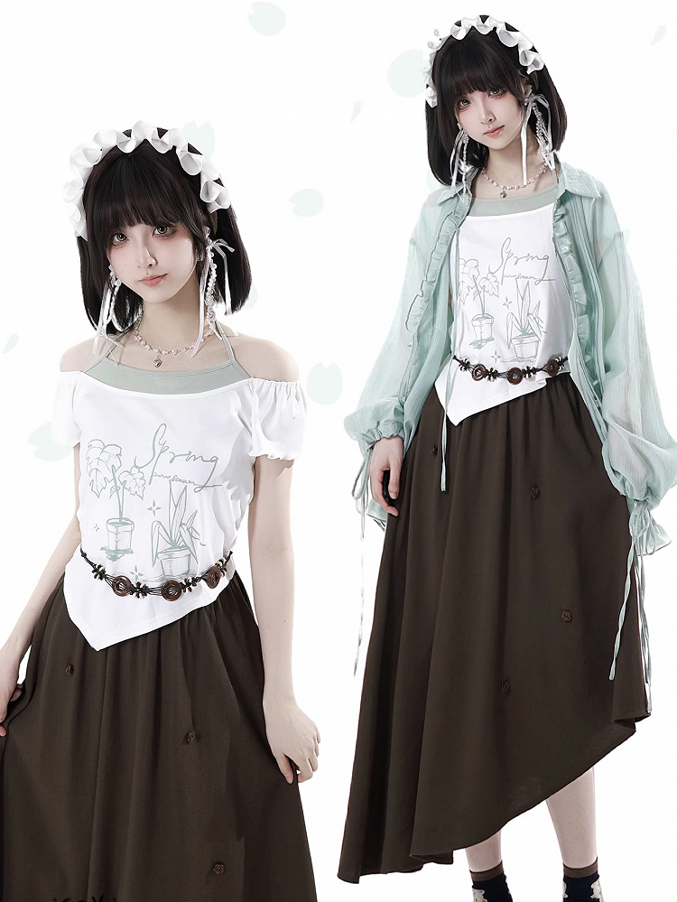 Off-the-shoulder Neckline White Graphic T-shirt Faux Two-pieces