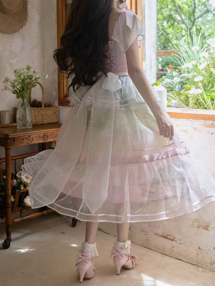 ● Oil Painting Print / Tiered Skirt / With Overlay