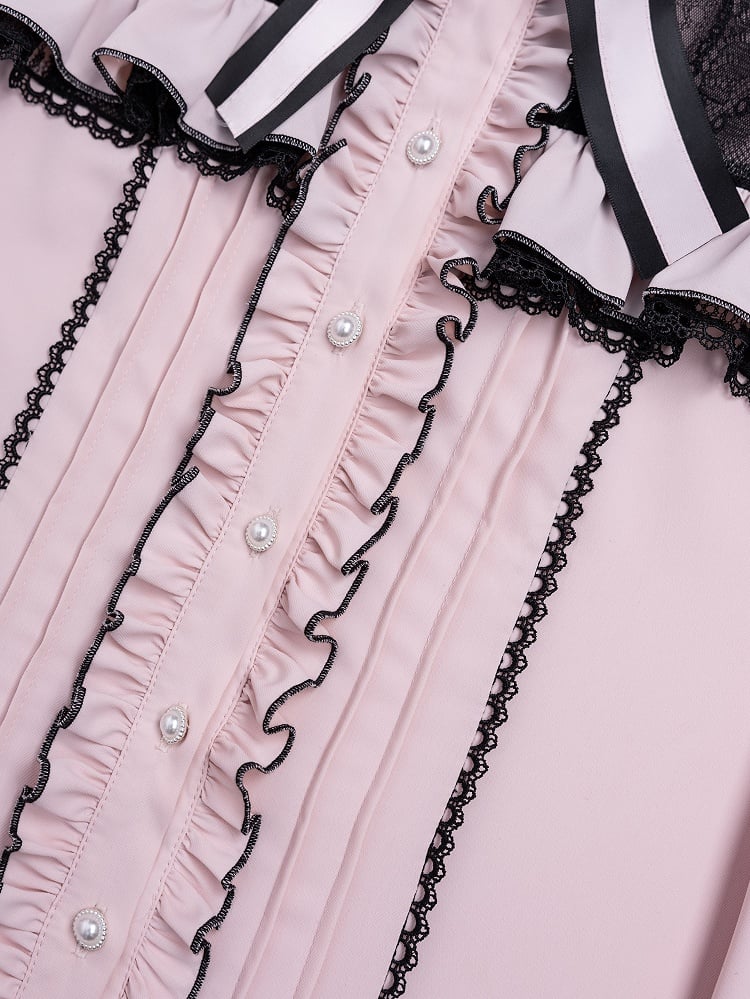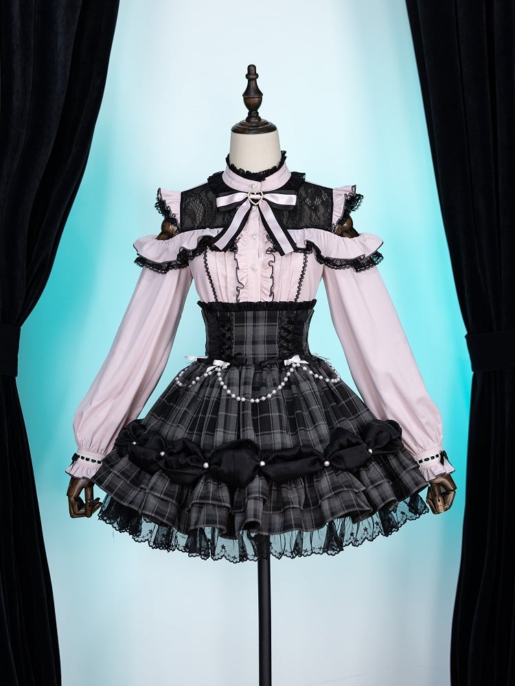A captivating design with open shoulders that add a touch of flirtatious allure, while the black illusion neckline provides a sophisticated contrast. Delicate ruffle trims and pleated front adds an element of texture and depth, a charming pink bow at the neckline serves as the perfect finishing touch, embodying the essence of Jirai Kei fashion with its subtle yet striking details.