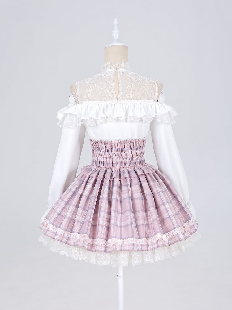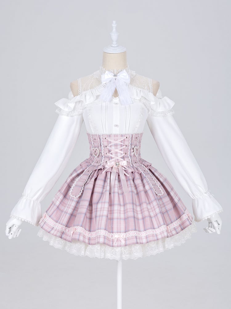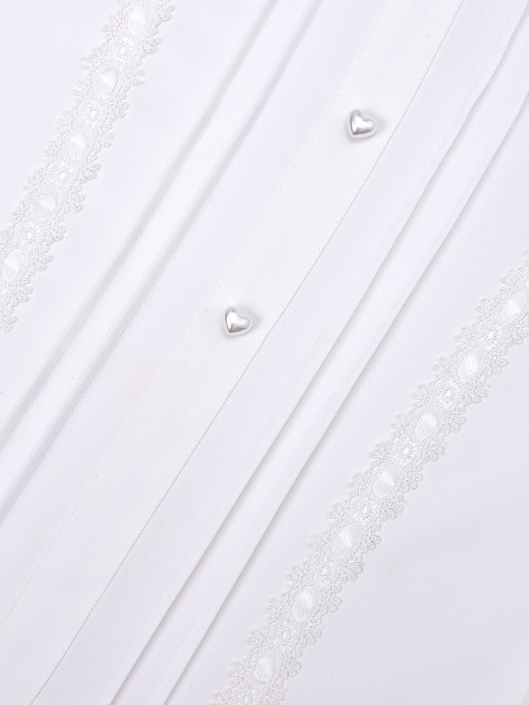 Exquisite White Jirai Kei Blouse: Featuring an intricate illusion neckline with a detachable bowtie, this blouse showcases layered off-shoulder ruffles and a heart-shaped button placket. The heart lace-trimmed flounce cuffs, adorned with delicate bows, add a touch of romance. Perfectly versatile, it pairs effortlessly with any skirt.