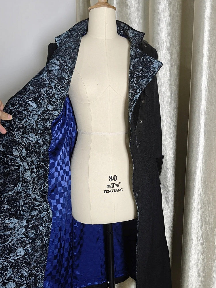 Ouji Fashion Black Leather Cuffs Gothic Lolita Woolen Coat with Blue Inner Lining