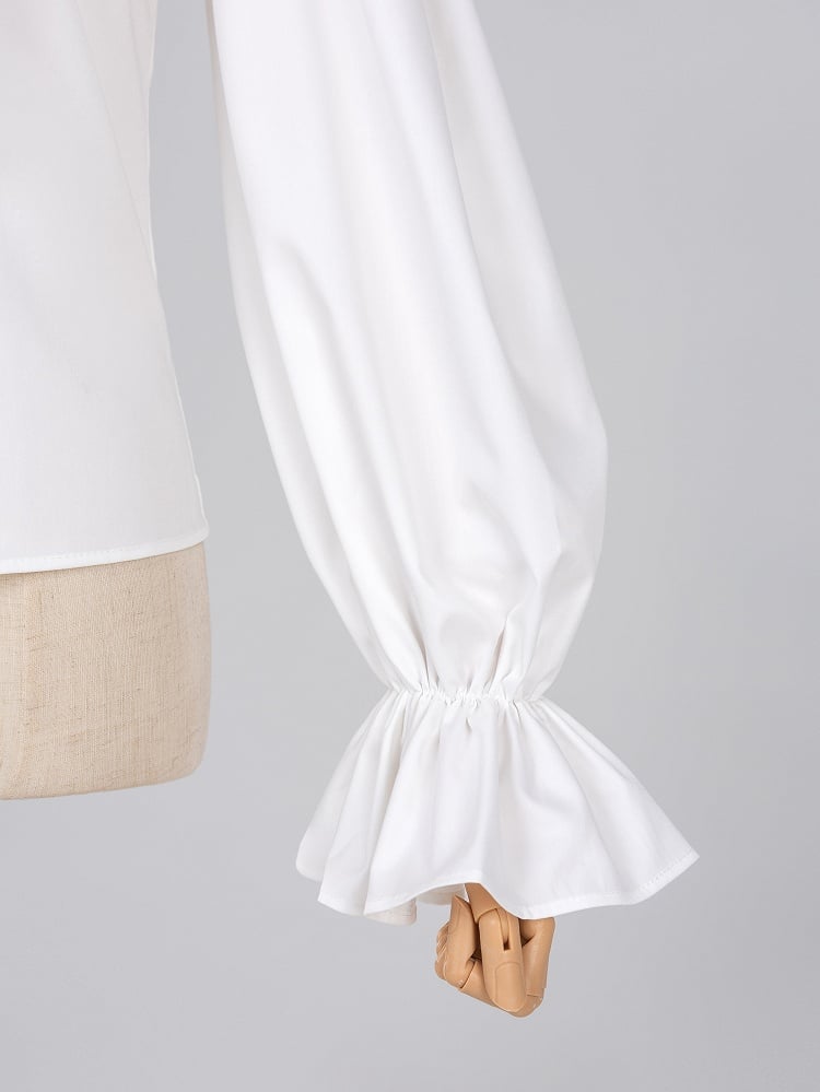 This long-sleeve shirt features elastic cuffs and a button-down front, enhanced by intricate pleated details that add a touch of sophistication. The standout piece is the separate clown collar, designed with charming ruffles and pointed collar, adorned with pom-pom-tipped ends, offering a unique, theatrical flair. Completing the ensemble is a detachable polka dot bowtie, adding a pop of fun and color to the classic white canvas.