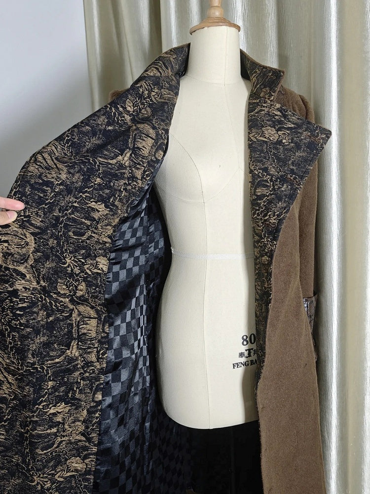 Crafted from wool-blend fabric, it offers both warmth and a luxurious feel. The coat features a striking lapel collar adorned with jeweled buttons that perfectly match the color of the collar itself, the sleeves are accentuated with sleek leather cuffs, and a leather strap with an antique-finish buckle is strategically placed on the front, enhancing the coat's unique aesthetic.