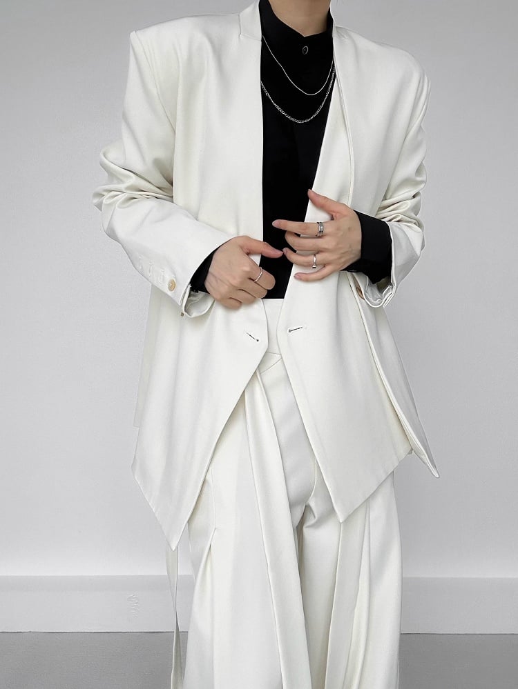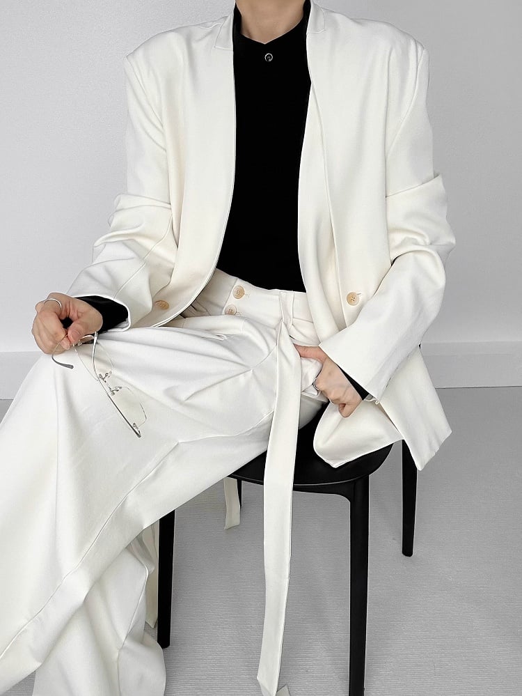 Yamamoto-Style Mid-Rise Wide-Leg Pants: Embrace a gender-neutral aesthetic with these elegant long pants, featuring a two-button fly and slant pockets. The unique side ribbons, stitched into the pant line and flowing downward, add a distinctive touch. Equipped with belt loops and vertical back pockets, these trousers blend the sophistication of dress pants with avant-garde design. Perfect for a contemporary and polished look.