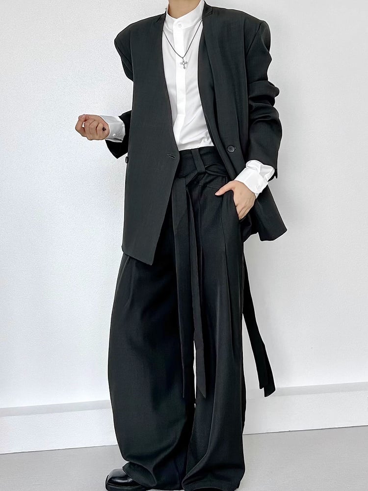 Yamamoto-Style Mid-Rise Wide-Leg Pants: Embrace a gender-neutral aesthetic with these elegant long pants, featuring a two-button fly and slant pockets. The unique side ribbons, stitched into the pant line and flowing downward, add a distinctive touch. Equipped with belt loops and vertical back pockets, these trousers blend the sophistication of dress pants with avant-garde design. Perfect for a contemporary and polished look.