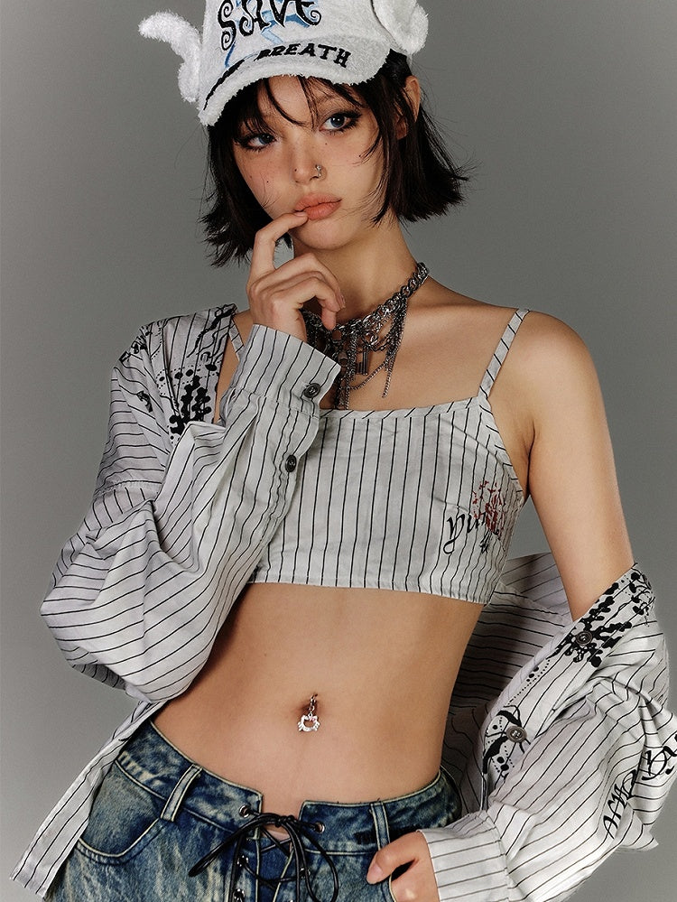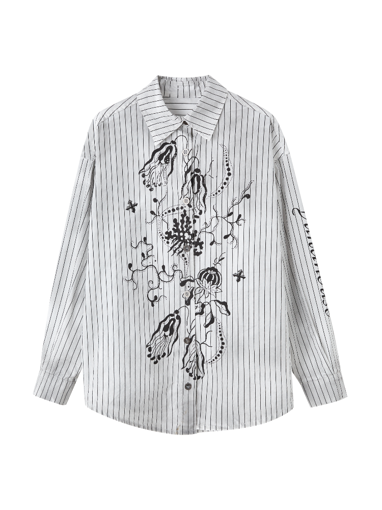 This unique shirt combines urban street style with a touch of rebellious flair. Featuring bold black and white stripes, it stands out with its eye-catching graffiti-inspired design. The distressed detailing adds a rugged, worn-in look, perfect for those who love a bit of edge in their wardrobe. Ideal for making a statement, this shirt pairs well with your favorite jeans or layered under a leather jacket for a complete streetwear ensemble.