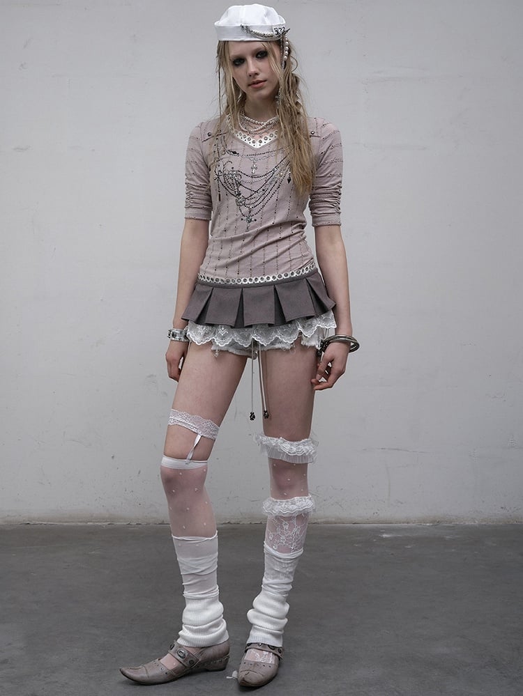 Dive into a world of edgy elegance with this Apocalyptic Punk Mini Skirt. Featuring structured box pleats for a bold silhouette, this skirt is adorned with charming bow accents that add a touch of femininity. The delicate lace trim enhances the skirt's unique aesthetic, making it a standout piece in any alternative fashion wardrobe. Perfect for those who love to blend rebellious style with delicate details.