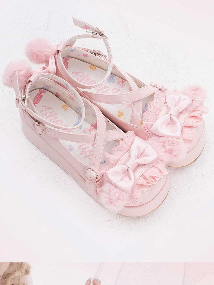 Step into a world of whimsy with these enchanting Sweet Lolita platform shoes. Featuring a charming crisscross design, these shoes are adorned with playful pom-pom accents and a plush bow topped with adorable bunny ears. The heart-shaped buckle adds a touch of romance, making these shoes the perfect blend of cute and stylish for any Lolita fashion enthusiast.