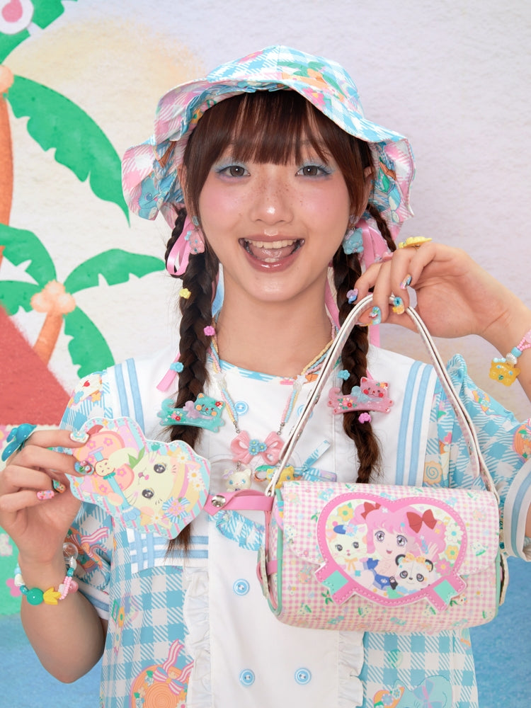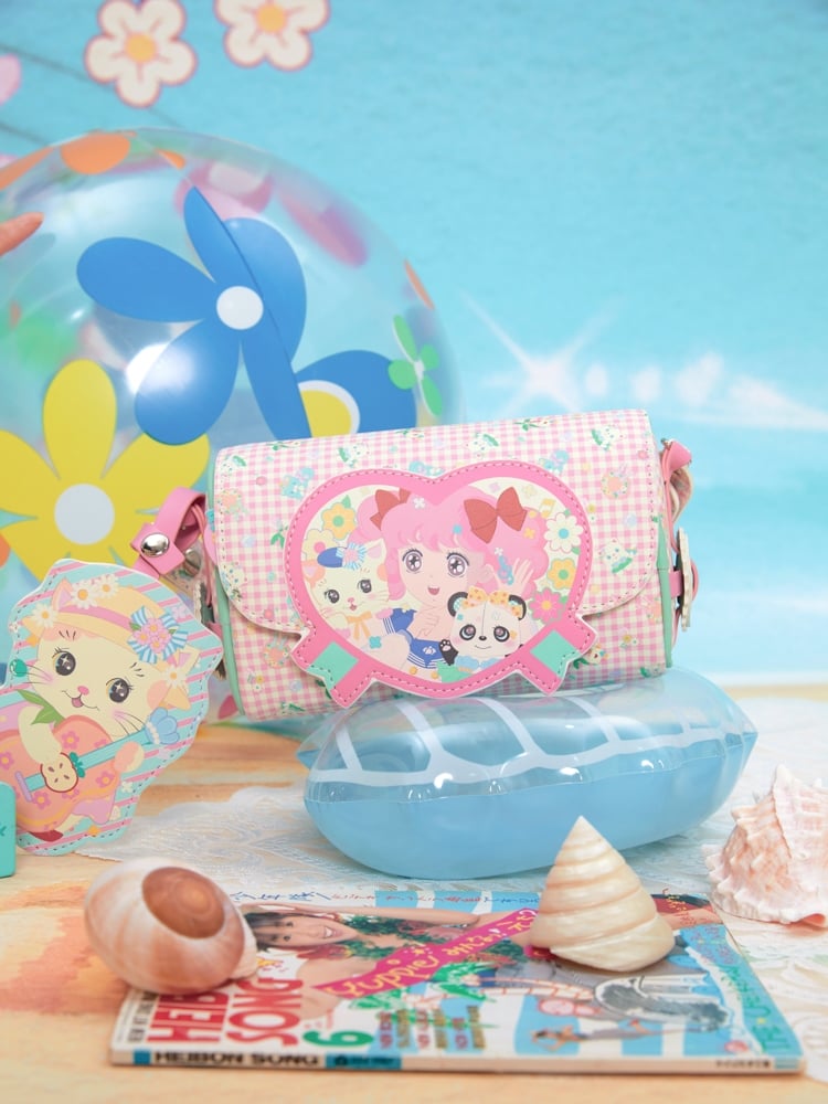 The pink plaid bag features printed decorations of Kitty and floral patterns. The bag cover is adorned with heart-shaped decorations featuring girl, Kitty, and panda prints, and when viewed from the side, the bag is heart-shaped. Additionally, the bag includes a charm in the form of a guitar-playing Kitty cardholder.