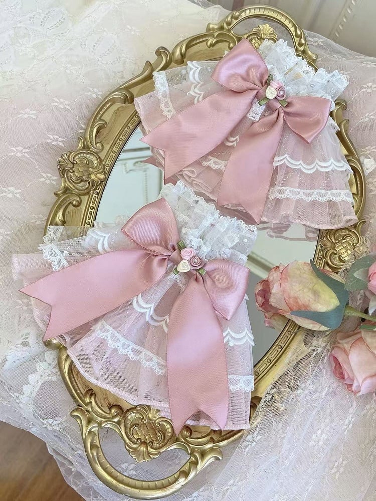These delicate wrist cuffs are the perfect accessory to complement any Lolita or fairy-tale inspired outfit. Crafted from soft, sheer tulle and adorned with intricate white lace trim, and the large, satin pink bows add a touch of sweetness, while the small fabric rose accents provide an extra hint of elegance.