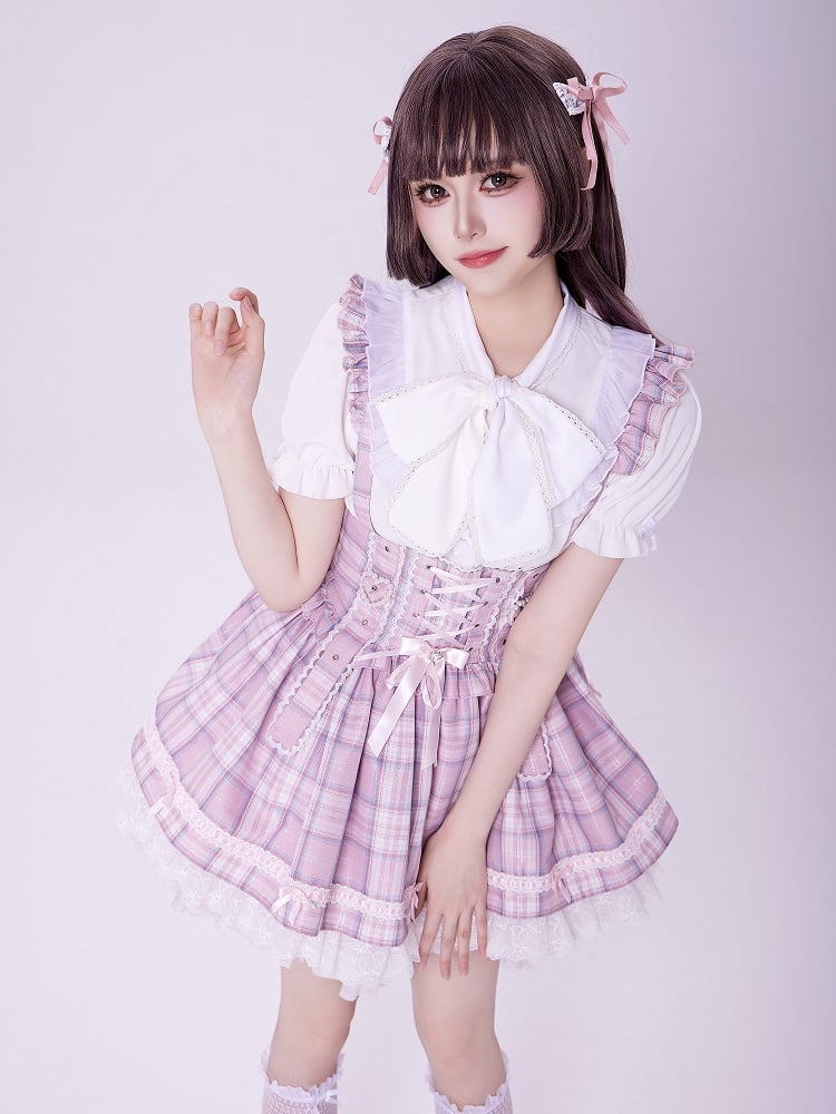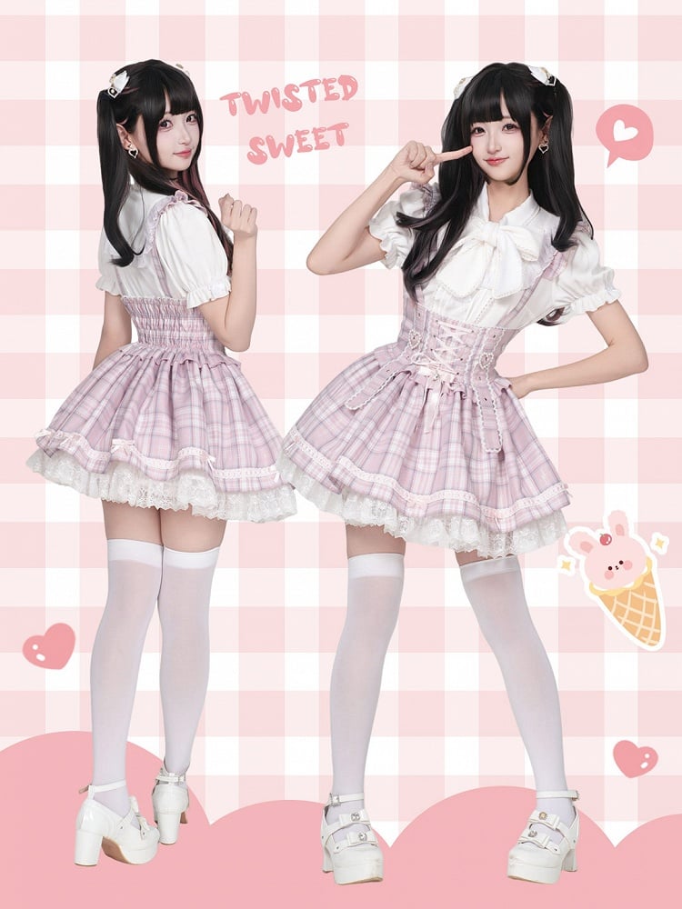 Pink Lace-up High Waist Jirai Kei Plaid Skirt with Detachable Flutter Straps