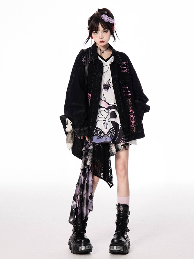 Pink Leopard Pattern Black Shirt Collar Faded Wash Vintage Denim Jacket