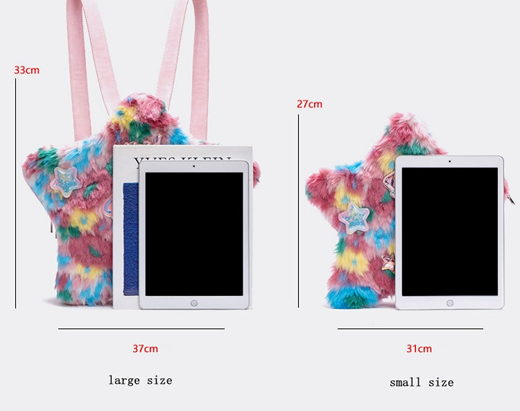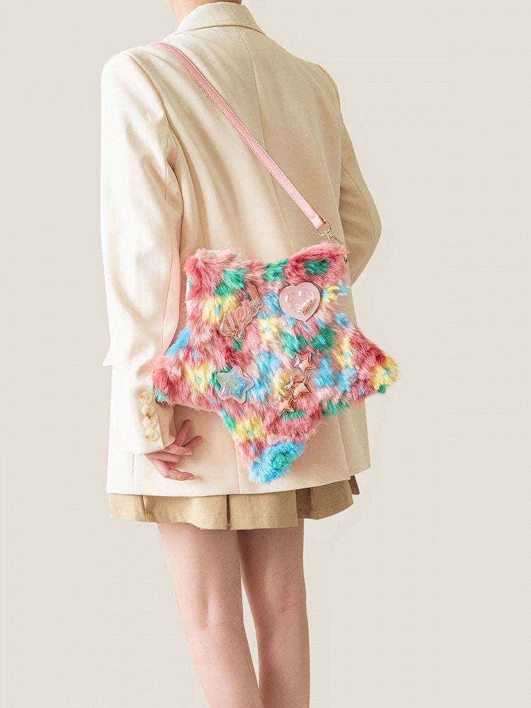 Embrace the charm of celestial whimsy with our Stellar Dreams Plush Star-Shaped Bag. This enchanting accessory is designed in the delightful shape of a star, making it a standout piece for any ensemble. The front of the bag is adorned with a plush, velvety texture, embellished with playful star and heart-shaped appliqués that add a touch of kawaii magic to your look.Whether you're stepping out for a casual day or dressing up for a special occasion, this bag is the perfect accessory to express your love for all things cute and dreamy.