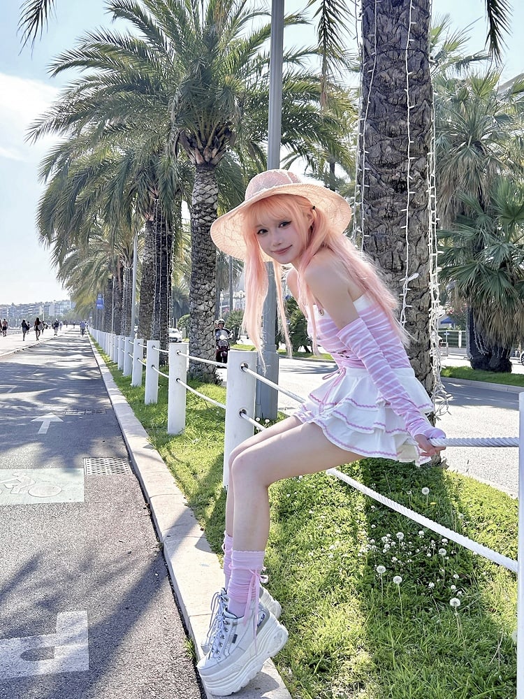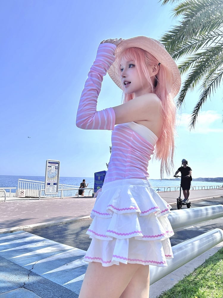 Pink Striped Pattern Navycore Self-tie Halter Dress Tiered Skirt with Free Armwear