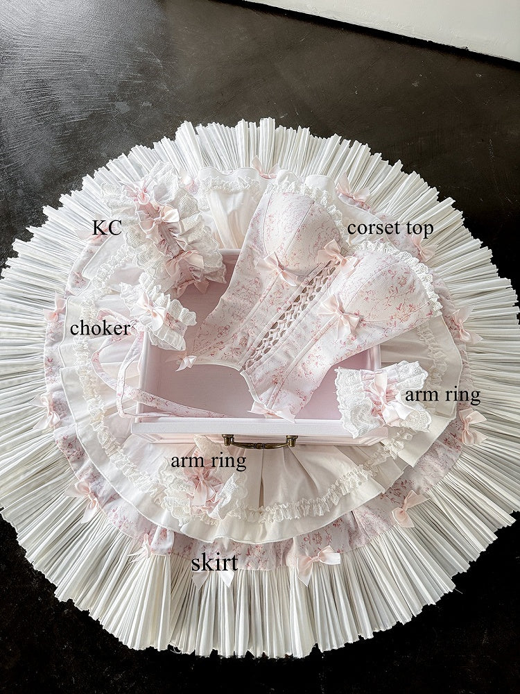 Pink & White Sweet Lolita Floral-Print Corset Top + Skirt + Choker + Arm Rings + KC Full Set