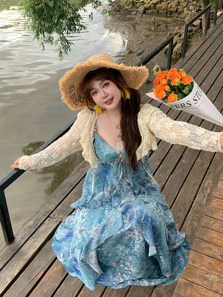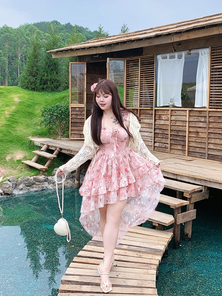 Plus Size Apricot Self-tie Straps Hollow-out Lace Top