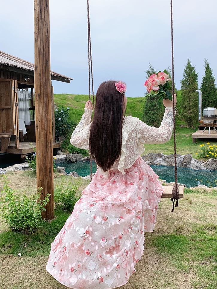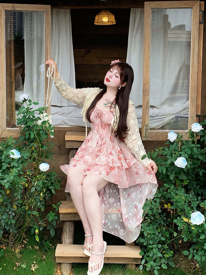 Plus Size Basque Waist Cascading Ruffle Pink Rosette Print Cami Dress High-low Skirt