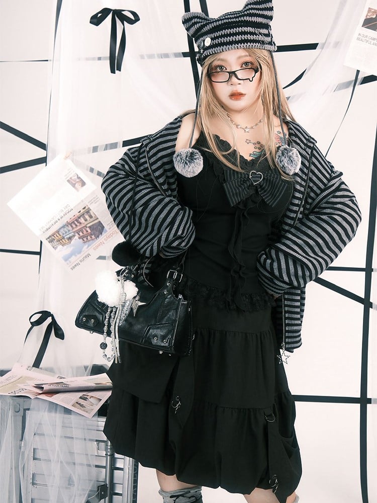 This black camisole features delicate thin straps and a gray V-neck with ruched lace trim, adorned by a gray and black striped bow with a heart-shaped buckle. The cascading ruffles lead to an exquisite hem of black lace with intricate floral embroidery.