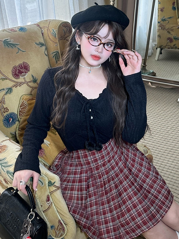 Plus Size Black Pompom Accents V-neck Long Sleeves Lace Top