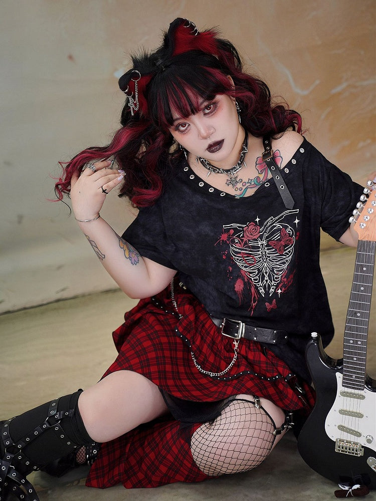 Plus Size Black Skeleton Print Punk T-shirt Buckle Shoulder Strap