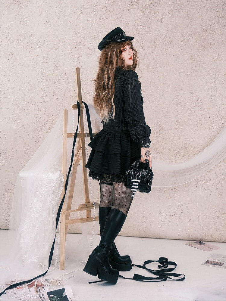 This plus-size black Y2K gothic top features a unique layered design with a striking white pinstripe pattern. A matching striped band extends from the left collar to the right neckline, secured with a button. The front hem is pointed on both sides, while the stretchy black fabric at the bust is adorned with cross and chain prints, complemented by real cross charms and white pearl chains. It also includes button closures on the placket and cuffs for added detail.