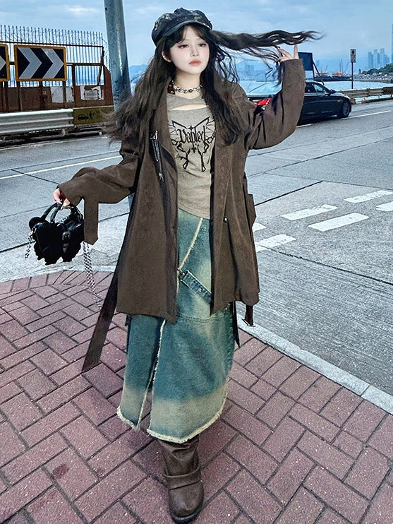 This skirt features classic washed denim fabric with a unique gradient color effect. The high slit at the front adds a touch of sensuality while ensuring ease of movement, perfectly blending style and functionality. The hem and slit are adorned with irregular fringe detailing, adding a rugged charm. Designed with multiple pockets for practicality and straps for a customizable fit, this skirt is available in plus sizes. Pair it with the matching top from the same collection for a complete look.