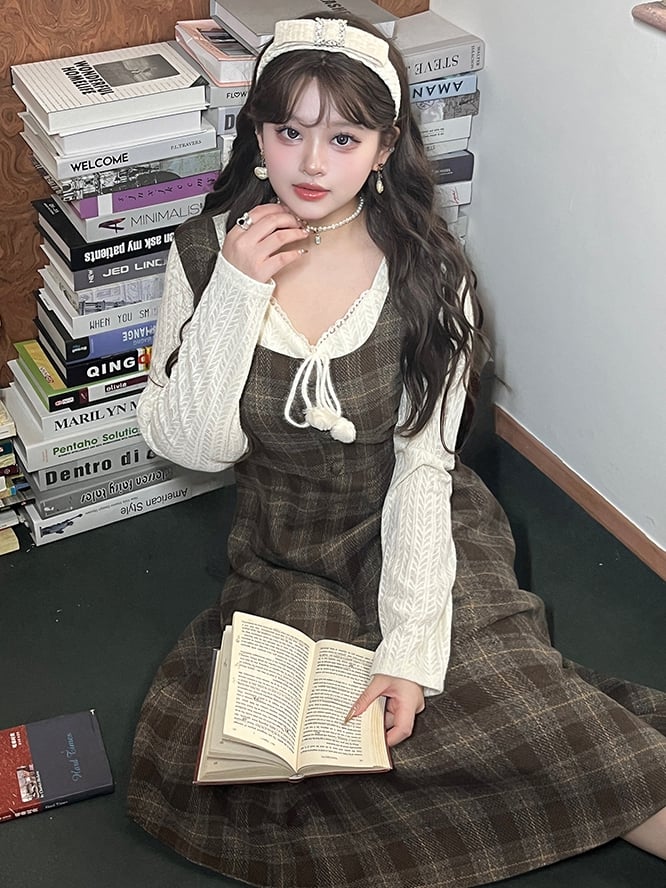 Embrace a timeless aesthetic with this vintage-inspired plaid wool overall dress, designed to flatter with its waist-cinching silhouette. Available in plus sizes, this dress exudes an artsy charm, perfect for those who appreciate a classic yet creative style. The ensemble is beautifully completed with a matching top and coat from the same series, offering a cohesive and polished look. Ideal for both casual outings and more formal occasions, this outfit captures the essence of retro elegance with a modern twist.
