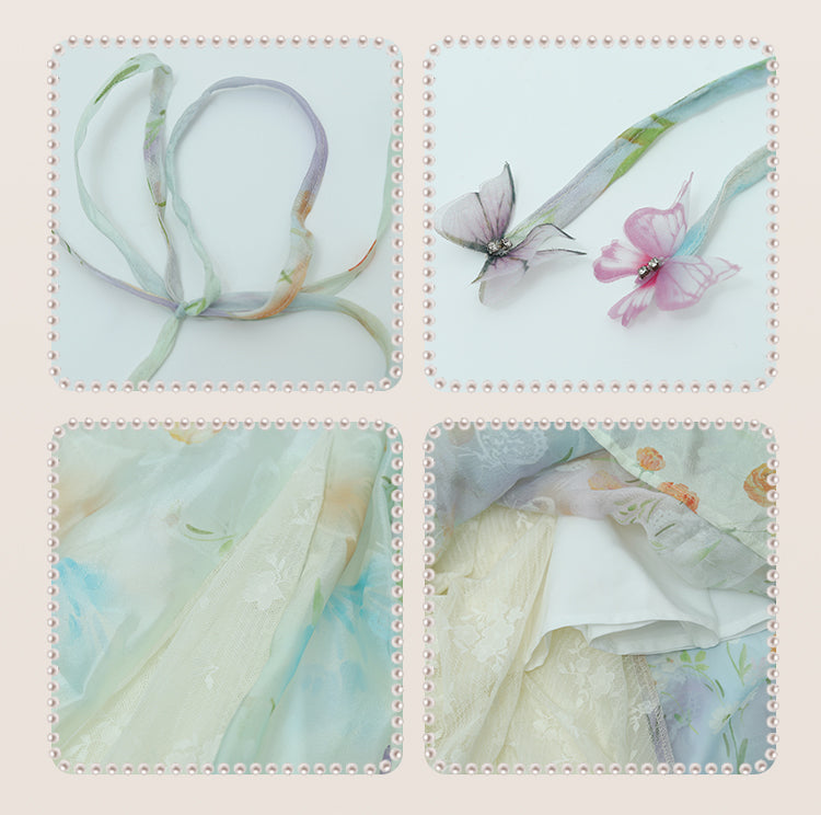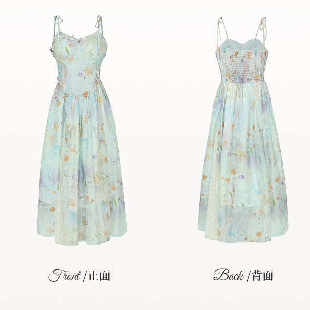 ● Contrast Lace Patches / Floral Print / Smocked Elastic at Back / Thin Shoulder Straps
