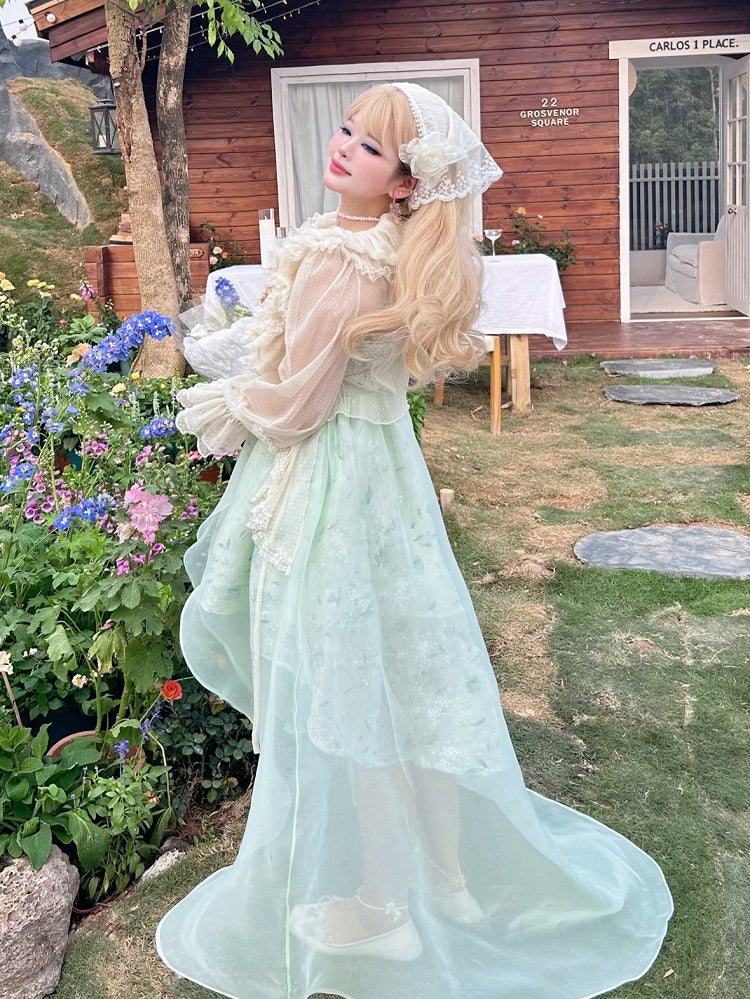 Plus Size Lace Trim Beige Self-tie Straps Long Sleeves Top