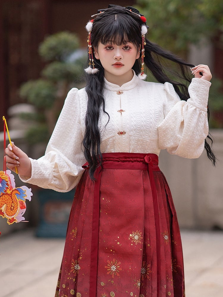Plus Size New Year Banded Collar White Long Sleeves Top