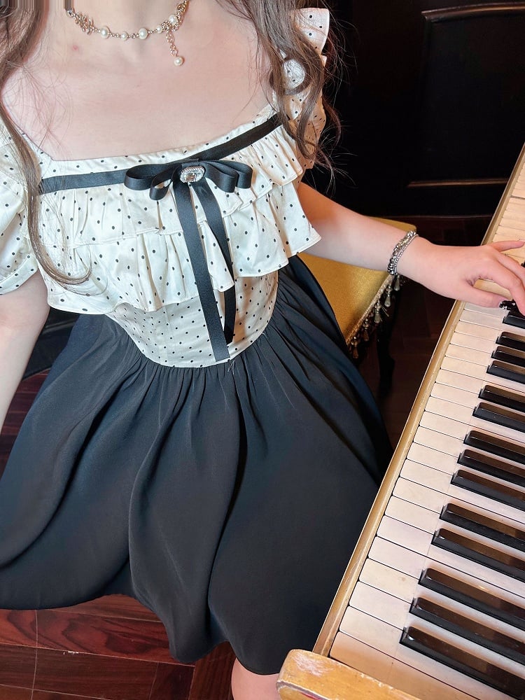 Plus Size Polka-dot Top White and Black Sweet Puff Sleeves Dress