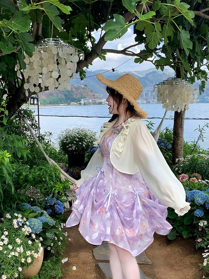 Plus Size Purple Bowknots Details Chiffon Floral Cami Dress Three Ways Wear