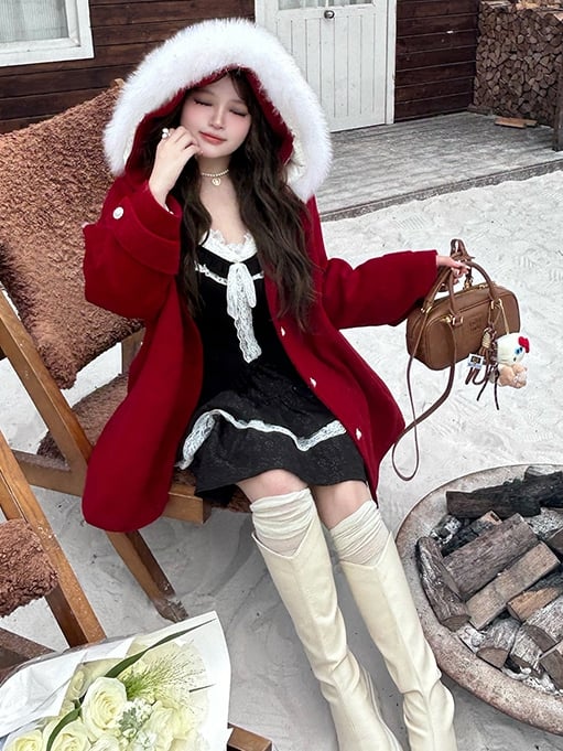 Wrap yourself in warmth and elegance with this charming woolen coat, designed for those who adore sweet and gentle aesthetics. The coat features a plush fleece trim along the hood, adding a touch of whimsy and comfort. Perfectly tailored for plus-size figures, it's the ideal piece to complement a fitted top and a short skirt or dress. Embrace the soft, sweet vibes while staying cozy and stylish.